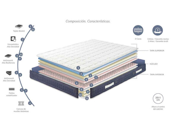Excelente estabilidad debido al núcleo de muelle tradicional Bonell bicónico, para un soporte firme y confortable de nuestra columna vertebral. Perfecta combinación con viscoélastica, para un descanso sano y reparador.